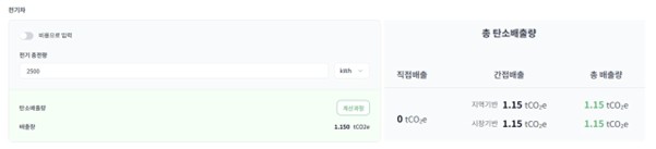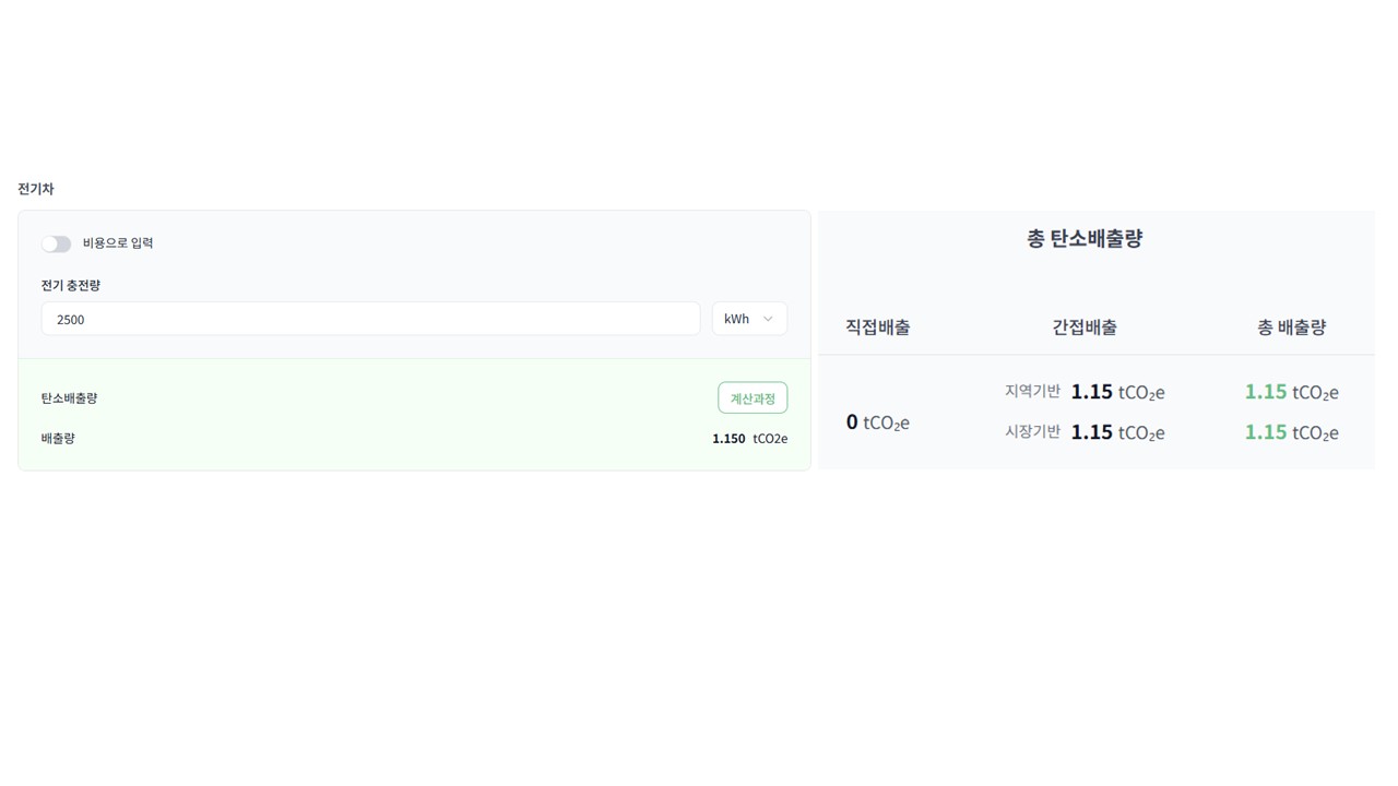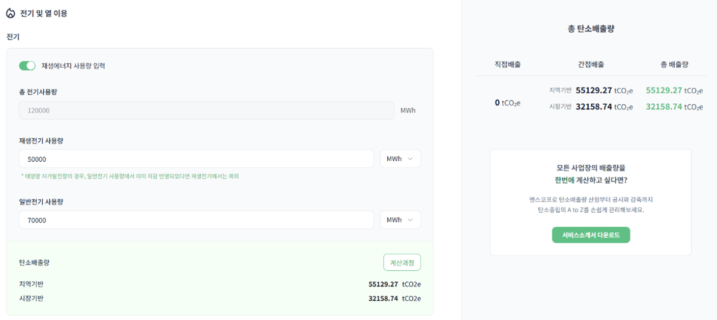 재생전기 사용량을 별도로 입력하면 시장기반 배출량 계산에 자동 반영됩니다. 단, 태양광 자가발전량이 이미 일반전기 사용량에서 차감된 경우에는 재생전기 입력 항목에서 제외해야 합니다.