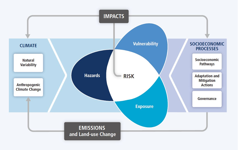 물리적 리스크 분석 방법론은 IPCC 4차 평가 보고서에서 구체적으로 다뤄지기 시작했으며, 이후 5차 평가 보고서와 6차 평가 보고서를 거치며 업데이트되었습니다. IPCC는 물리적 리스크를 위해(Hazard), 노출(Exposure), 취약성(Vulnerability)의 함수로 정의합니다.
