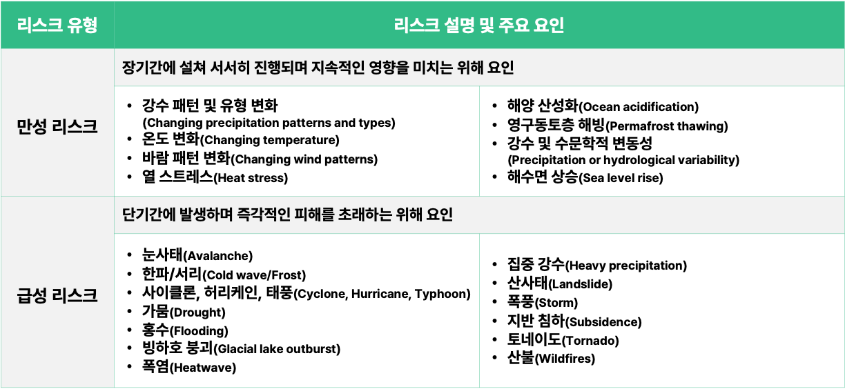 ● 위해(Hazard) : 기후변화로 인해 잠재적으로 부정적인 영향을 미칠 수 있는 사건이나 현상(예: 폭염, 홍수, 해수면 상승 등)