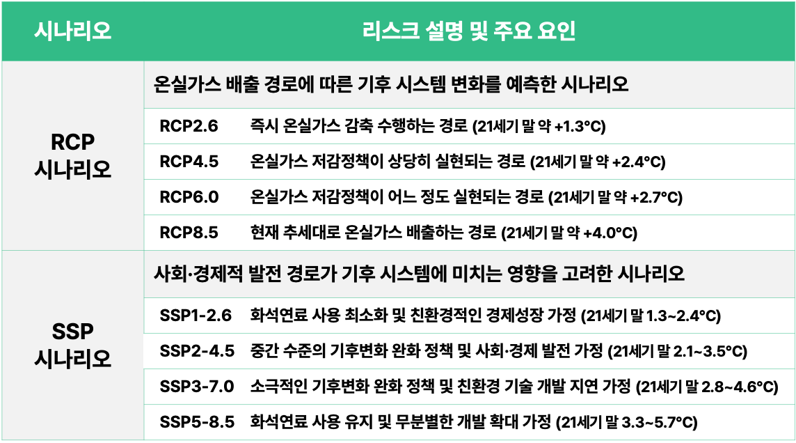 위해 요인을 선정한 후에는 조직의 리스크를 가장 잘 반영할 수 있는 기후변화 시나리오를 선택해야 합니다. 일반적으로IPCC에서 제시하는 두 가지 시나리오 체계가 널리 활용됩니다. 특히, 물리적 리스크 평가에서는 일반적으로 최악의 시나리오(RCP8.5, SSP5-8.5)를 선택하여 잠재적 위험을 과소평가하지 않는 것이 필요합니다.
