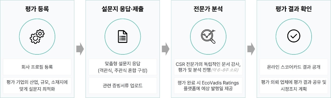 에코바디스 평가는 평가 등록 → 설문 응답 및 증빙 제출 → 전문가 분석 → 결과 확인의 4단계로 진행됩니다.