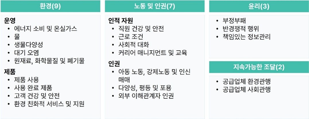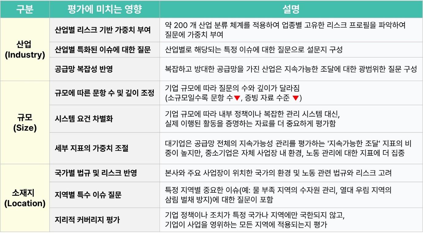 평가 항목은 기업의 산업 특성 및 사업 구조에 따라 가중치가 다르게 부여됩니다. 예를 들어, 제조업이라면 ‘환경’ 비중이, 서비스업은 ‘노동 및 인권’ 비중이 상대적으로 높게 적용됩니다.