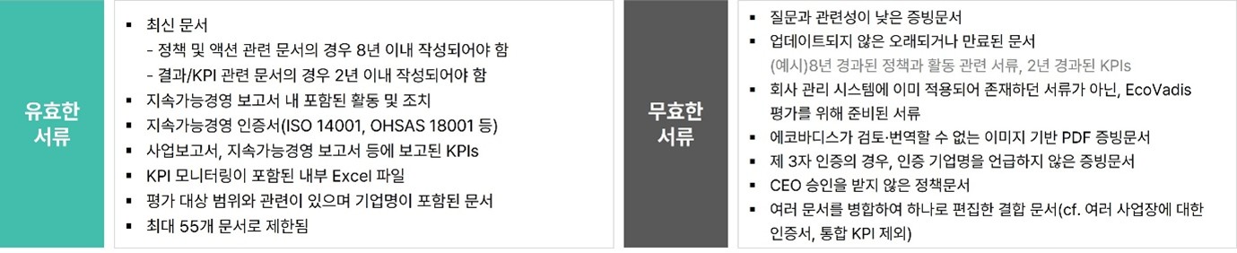 또한, 제출 서류는 회사 내부 관리 체계에 따라 실제로 운영 중인 문서여야 하며, 에코바디스 평가만을 위해 새로 작성된 초안 형태의 자료나 CEO 승인을 거치지 않은 정책 문서는 인정되지 않습니다. 서류의 유효기간은 작성일을 기준으로 판단되며, 정책·계획 문서는 8년 이내, KPI 및 성과 관련 문서는 2년 이내에 작성된 문서만 평가에 반영됩니다.