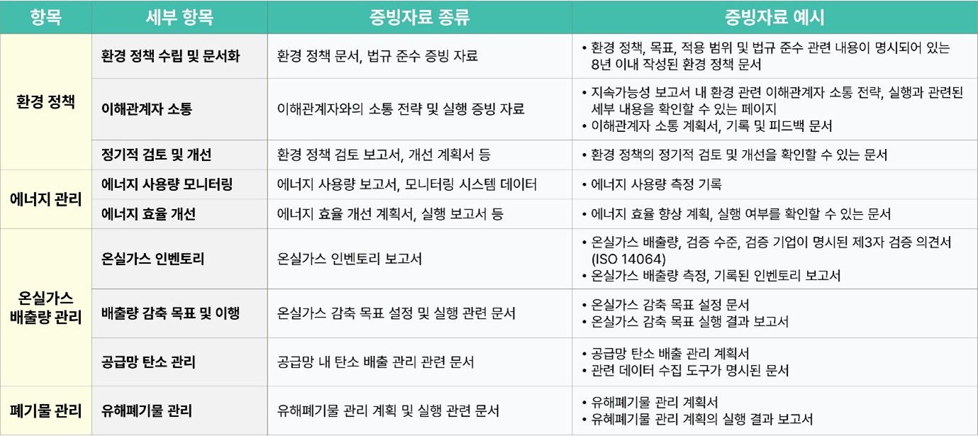 <표4> 에코바디스 환경 부문 세부 항목별 증빙자료 예시