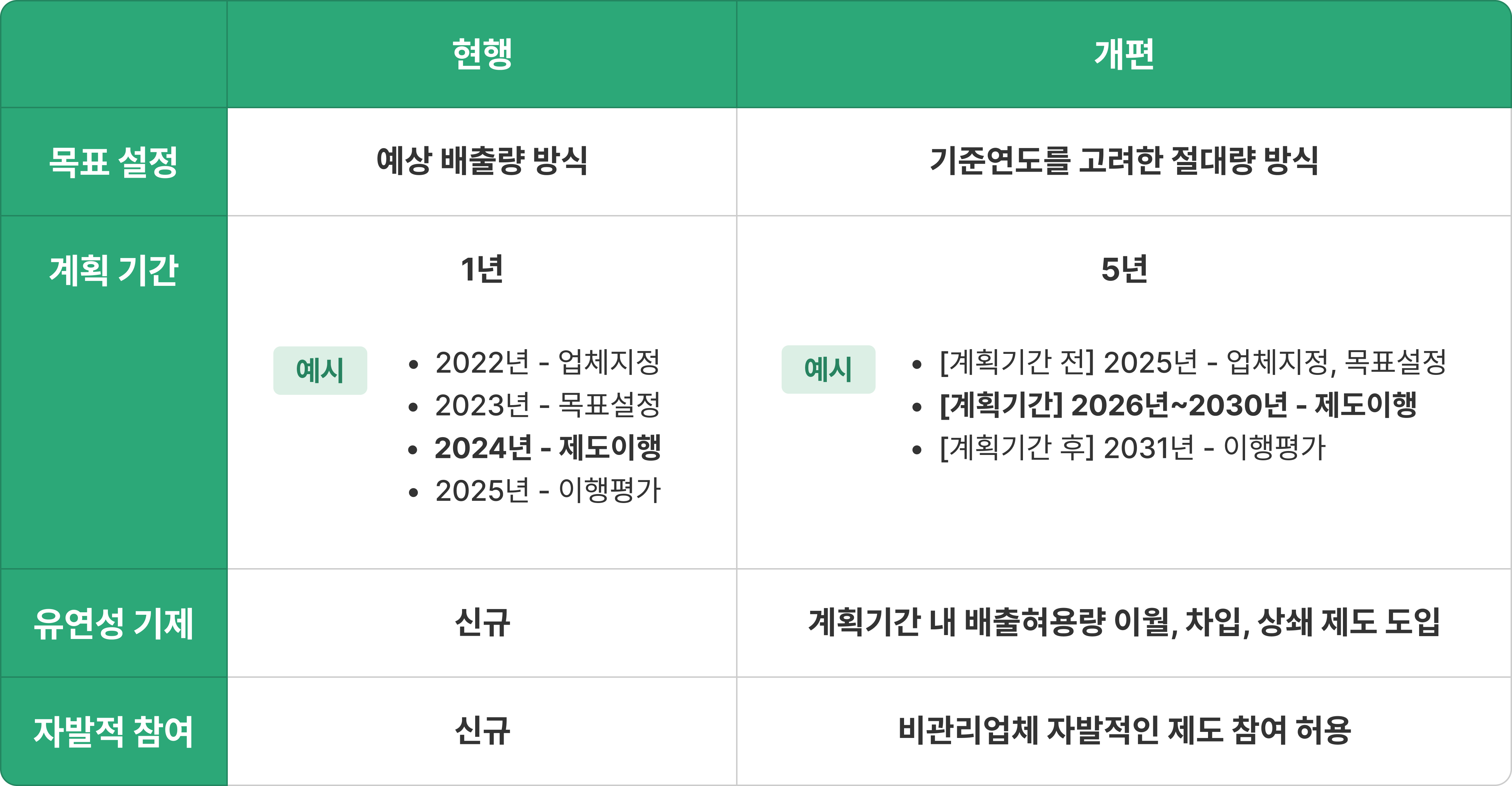 - 목표 설정 방식이 예상 배출량에서 기준연도를 고려한 절대량으로 바뀝니다. 현행 목표설정 기준은 기존 배출시설의 기준연도 배출량을 바탕으로 예측한 이행연도 예상배출량에 따랐지만, 개정안에선 기존 배출시설의 기준연도 배출량 혹은 2018년 배출량에 부문·업종별 감축률을 적용한 뒤 과거 감축 노력 인정분을 더하여 목표를 설정합니다.