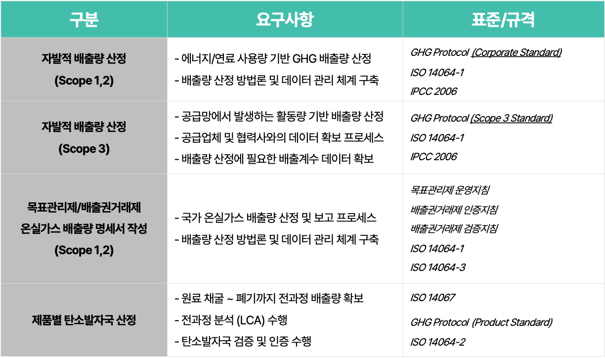 온실가스 배출량 제3자 검증을 준비하는 기업은 국내/외 다양한 표준과 지침 중 어떤 지침에 근거하여 인벤토리를 구축하고, 배출량을 산정해야 할지 어려운 경우가 많습니다. 실제로 국내 목표관리제/배출권거래제 검증 표준과 자발적 검증에서의 검증 표준은 유사하나, 배출량 산정 및 보고의 목적별로 사용되는 검증 표준은 차이가 있을 수 있습니다.