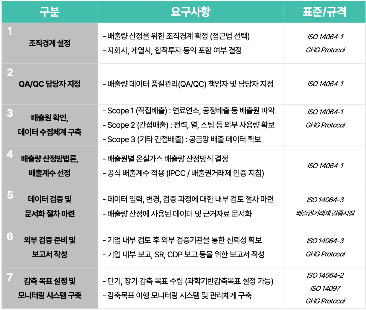 온실가스 배출량 산정~검증 과정에서 절차별로 기업이 준비/수행해야 할 주요 내용들과 참고해야 할 표준은 아래의 표로 정리하였습니다. 각각의 절차별로 기업은 온실가스 배출량을 정확하고 신뢰성 있게 산정/보고/검증해야 하며, 최종적으로는 감축목표 설정 및 감축에 대한 모니터링 시스템 구축까지 단계별로 진행 시 ISO 14064-1, ISO 14064-3, GHG Protocol 등 규격을 참조하여 절차별로 수행하면 됩니다.