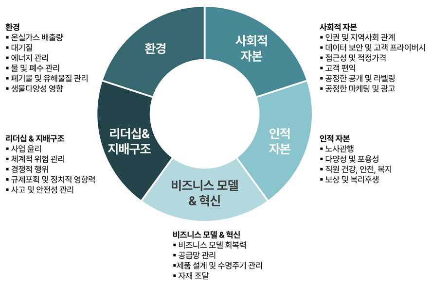 지속가능성 정보는 기후, 안전, 인권, 공급망, 데이터 보안, 지배구조 등 다양한 영역을 포함합니다. SASB가 제시하는 5대 지속가능성 이슈는 이러한 복잡한 영역을 이해하는 데 도움이 되는 가장 널리 쓰이는 구조입니다.