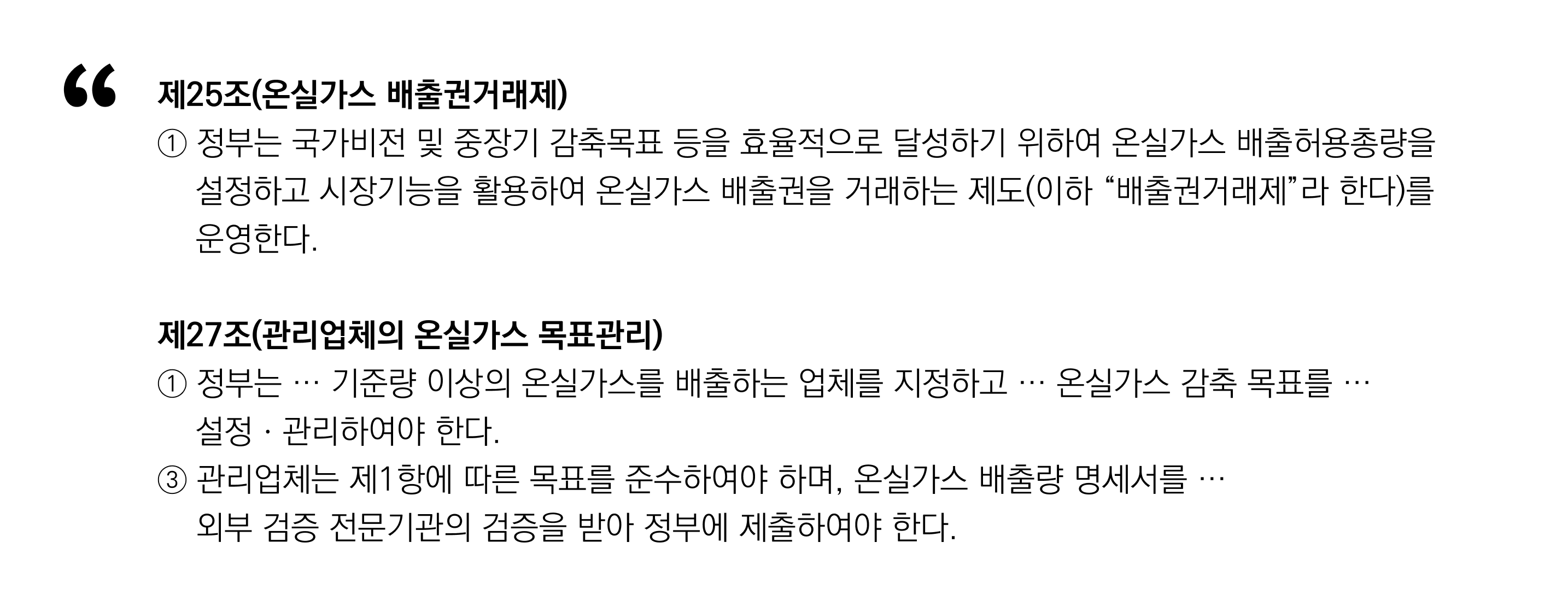 기본법은 현재 우리나라 탄소중립의 가장 근간이 되는 법률로 역할하고 있습니다. 이 법은 2050년 탄소중립을 목표로 국가 전략을 수립하라는 큰 방향성을 제시하고 있는데, 우리나라는 이 법을 바탕으로 “2030년까지 국가 온실가스 배출량을 2018년 대비 40% 감축하겠다”는 국가목표를 수립해 국제사회에 제출하기도 했지요. 그리고 바로 이 기본법에서 감축목표에 대한 달성 수단으로 배출권거래제와 목표관리제를 운영함을 선언하고 있습니다.