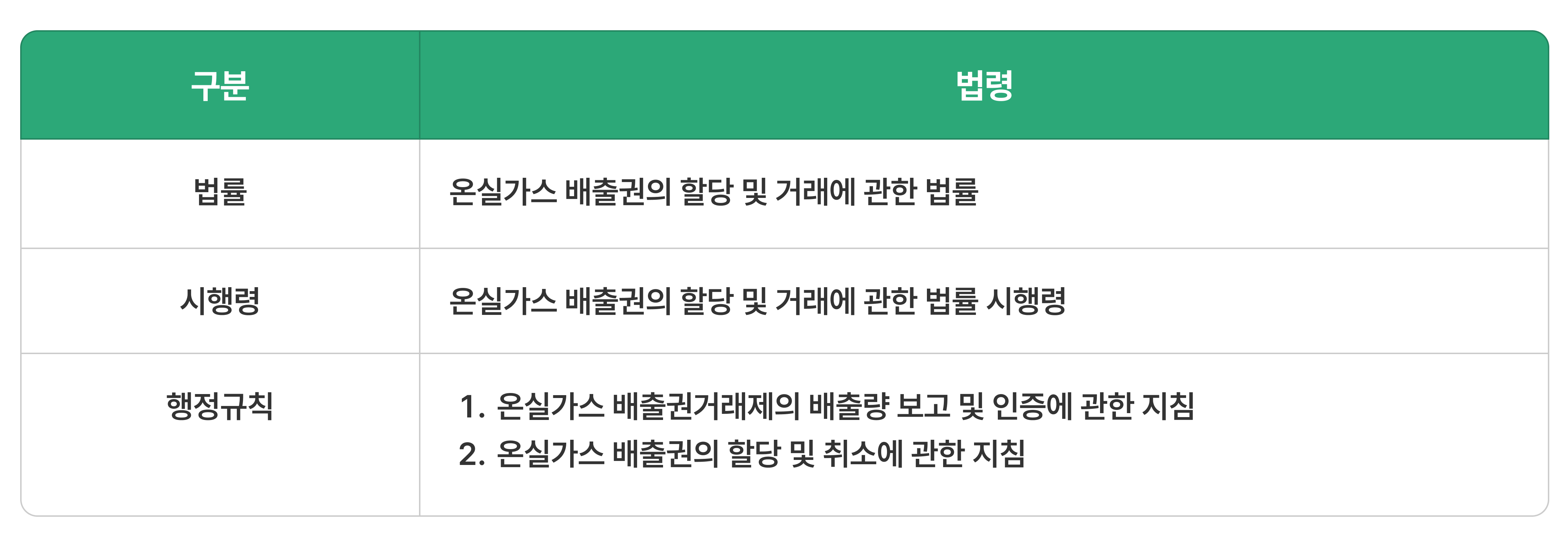 배출권거래제는 기본법 제25조 제2항에 따라 별도의 법률로써 규정되고 있습니다. 특히 하위의 행정규칙들은 배출권거래제와 목표관리제의 대상 업체들이 온실가스 배출량을 산정하고 보고하는 데 직접적으로 활용하는 무척 중요한 법령들입니다.