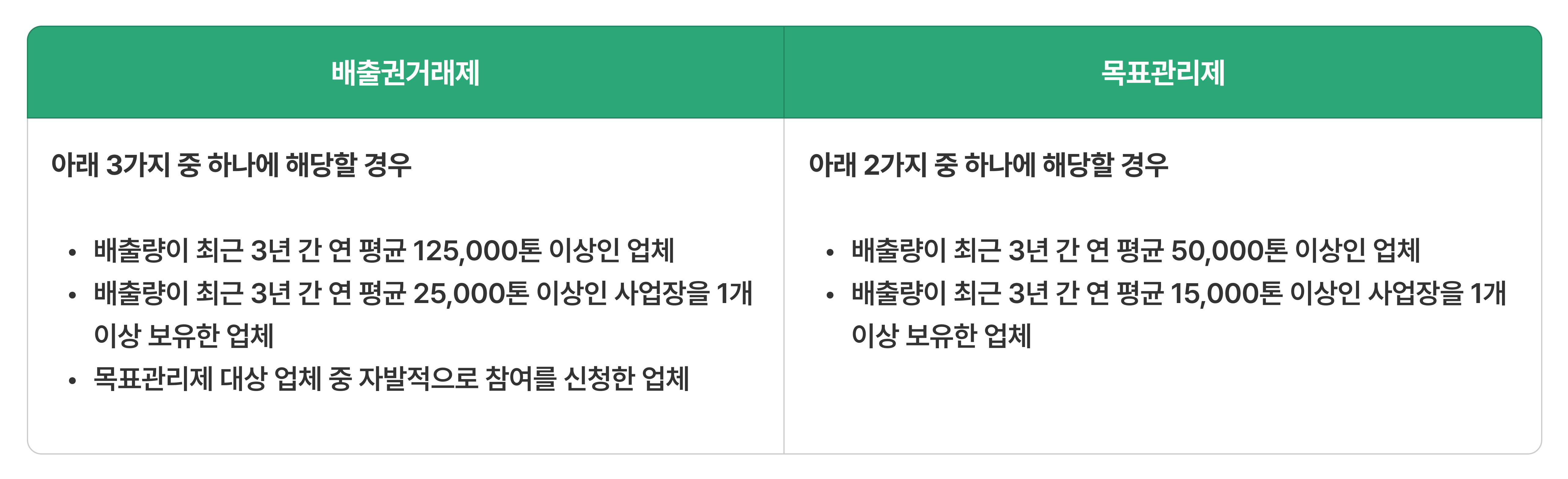 참고로, 2024년 10월 10일 환경부는 현행 목표관리제를 개편하는 안을 발표하며, 위의 대상업체 기준에 충족하지 않더라도 자발적으로 제도에 참여할 수 있도록 할 것이라고 밝힌 바 있습니다. (자세히 읽기)