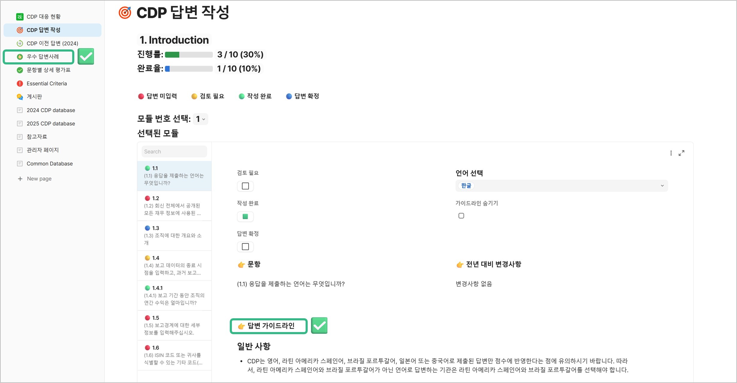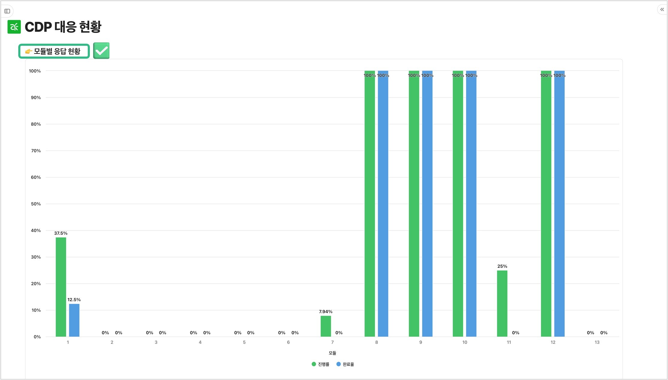 문항별 작성 현황을 한눈에 정리해 보여주는 요약 대시보드는 전체 진행 수준, 미작성 항목, 보완 우선순위를 직관적으로 확인할 수 있어 실무자가 복잡한 CDP 프로젝트를 체계적으로 관리할 수 있도록 돕습니다.