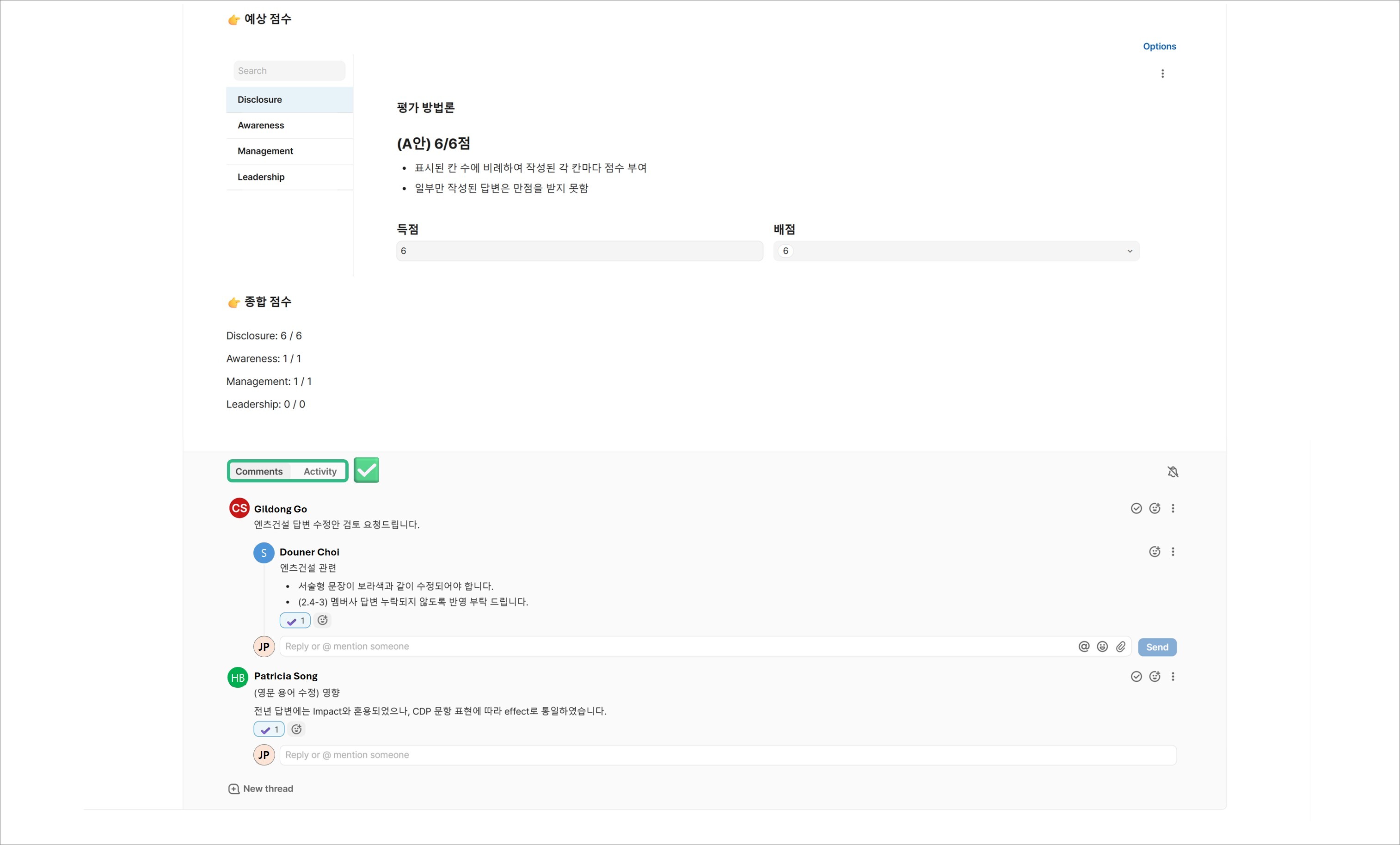 또한 각 문항 화면에서 바로 의견을 주고받을 수 있는 댓글 기능을 통해 이메일로 소통하며 여러 버전의 문서를 관리해야 했던 기존 방식의 비효율이 크게 줄어들었습니다. 팀 단위로 병행 작업이 많은 CDP 특성상 이러한 협업 기능은 업무 속도와 품질을 동시에 높여주는 핵심 요소입니다.