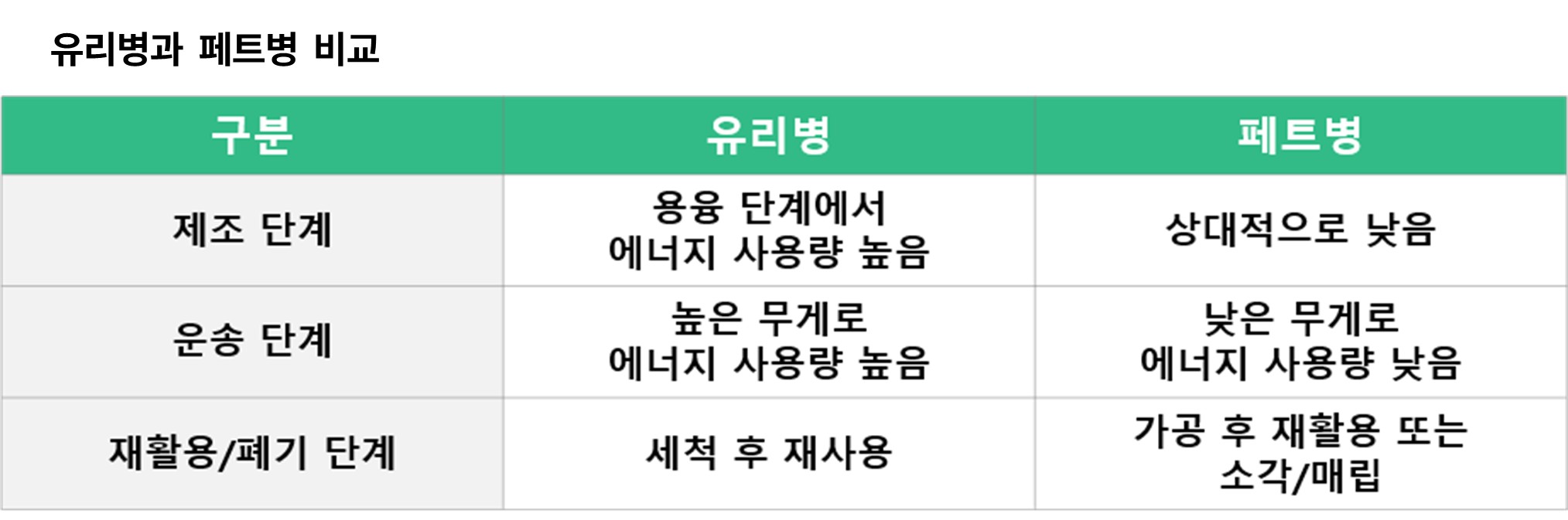 페트병은 원료인 석유 기반 플라스틱(PET 등)을 추출·정제하여 생산하며, 가볍고 운반이 효율적입니다. 반면 유리병은 높은 온도에서 가공이 필요하여 에너지가 많이 투입되고, 무겁기 때문에 운반 과정에서도 많은 에너지가 소요됩니다. 따라서 아래와 같이 표로 정리를 해보자면 유리병이 항상 더 친환경적이라고 할 수는 없습니다.