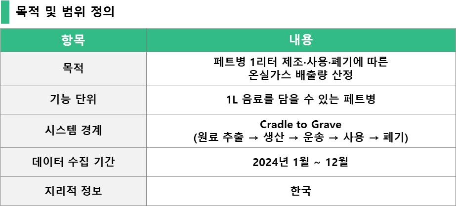 산정을 위해 산정 목적, 기능 단위, 시스템 경계 등을 설정하여 어떻게 산정을 할지 밑그림을 그린다고 생각하면 됩니다. 페트병 제조 업체를 예시로 들면 아래 표와 같이 목적 및 범위를 정의할 수 있습니다.