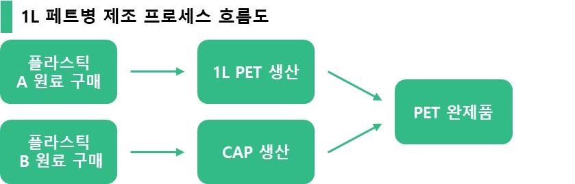 다음으로는 데이터를 수집하는 단위공정을 설정하고 단위공정을 연결하여 프로세스 흐름도를 작성하고 데이터를 수집하고 계산하게 됩니다. 플라스틱 원료를 구매하여 페트병을 제조하는 업체를 예시로 하면 아래와 같이 프로세스 흐름도를 작성하여 데이터를 수집할 수 있습니다.