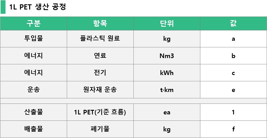 그리고 각 단위공정 별로 투입물(원료, 에너지, 운송 등)과 산출물(배출가스, 폐기물 등)을 정량적으로 수집하고 정리합니다. 1L PET 생산을 예로 들어 투입물과 산출물을 정리하면 아래와 같습니다.