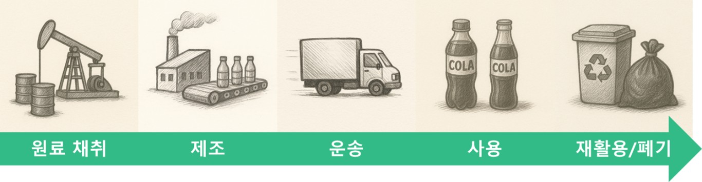 예를 들어 콜라병의 두 종류 “유리병”과 “페트병”을 비교해 보겠습니다. 우리는 흔히 “유리병이 페트병보다 환경적이지!”라고 생각합니다. 유리병이 페트병보다 재활용률이 높기 때문입니다. 하지만 콜라병 제품의 전생애주기를 살펴보면 결과가 달라질 수 있습니다.