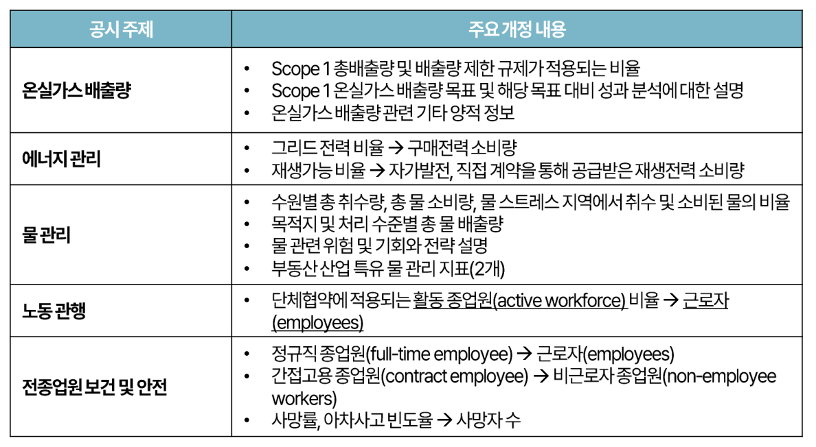 - 초미세먼지(PM2.5) 공시 추가: 규제가 증가하는 초미세먼지(PM2.5) 배출량 공시를 기존 미세먼지(PM10)에 더해 새롭게 요구