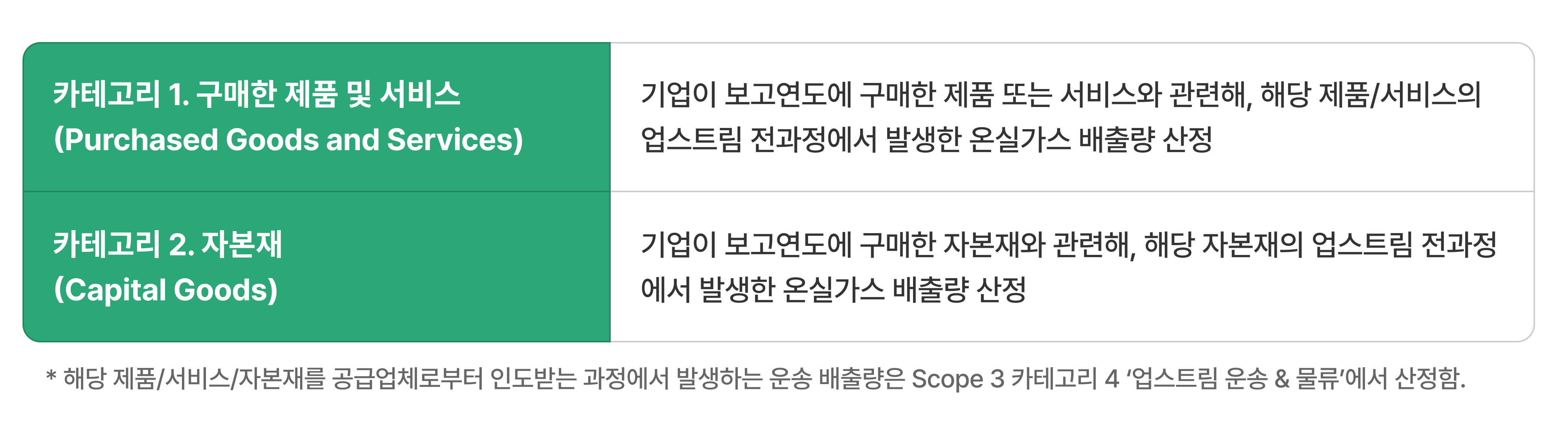 위 표에서 알 수 있듯, 1번 카테고리인 ‘구매한 제품 및 서비스(Purchased Goods and Services)’는 기업이 보고연도에 구매한 제품 또는 서비스와 관련해 업스트림 전과정(cradle-to-gate)에서 발생한 온실가스 배출량을 산정하는 카테고리이고, 2번 카테고리인 ‘자본재(Capital Goods)’에서는 기업이 보고연도에 구매한 자본재와 관련해 업스트림 전과정(cradle-to-gate)에서 발생한 온실가스 배출량을 산정합니다.