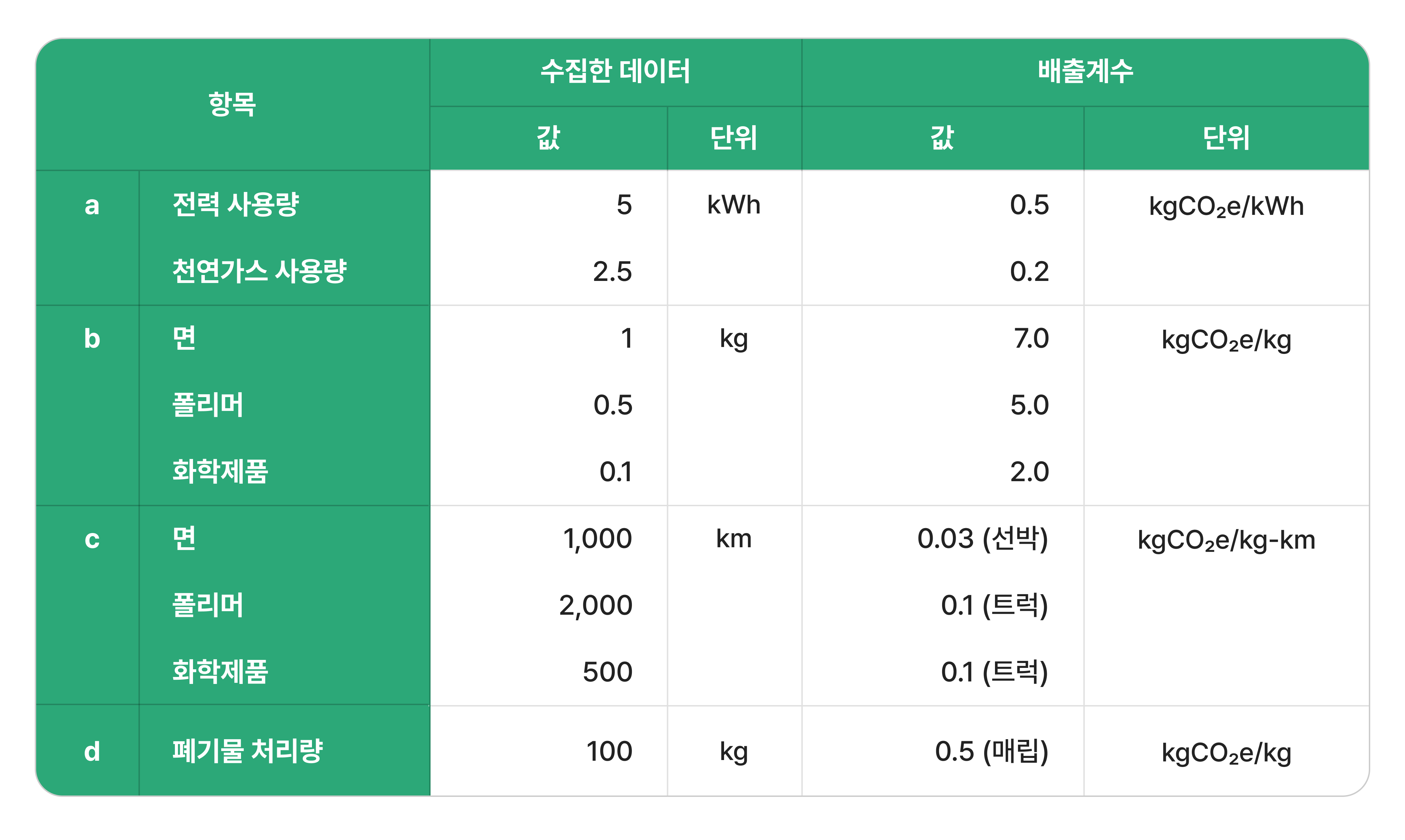 예를 들어 전력과 천연가스에 대한 배출계수는 「온실가스 배출권거래제의 배출량 보고 및 인증에 관한 지침」을 기반으로, 폐기물 처리와 운송수단에 대한 배출계수는 환경성적표지 등을 참고해 수집할 수 있습니다. 원재료의 배출계수 또한 직접 수집이 어렵다면 국내외 LCI DB를 활용해 구할 수 있습니다.