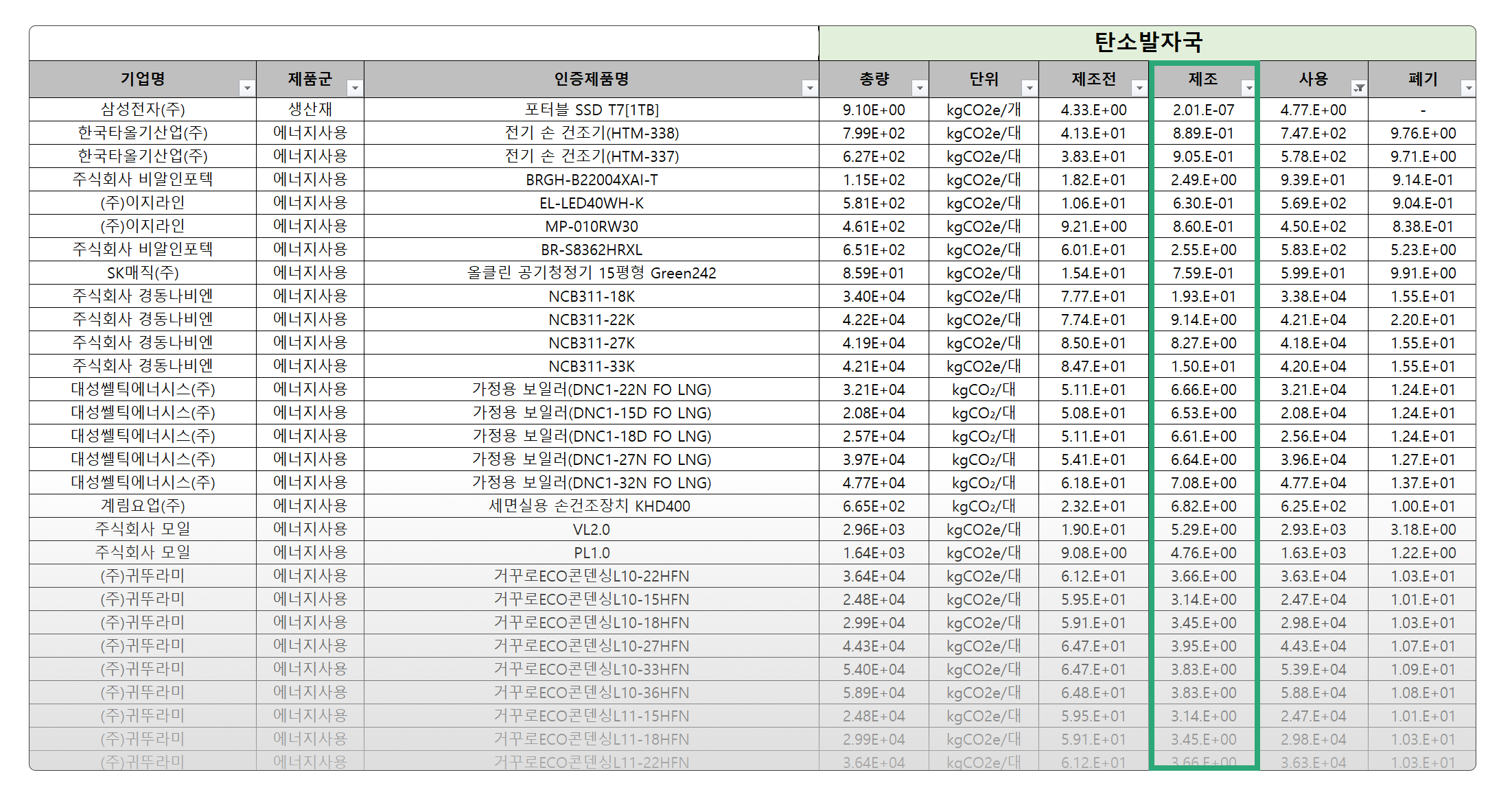 만약 최종재 완제품이 환경성적표지 인증을 받은 경우, 한국환경산업기술원 홈페이지에서 환경성적표지 인증제품 목록을 다운로드 받아 해당 제품의 단위 당 전 과정 탄소배출량을 직접 확인할 수 있습니다.