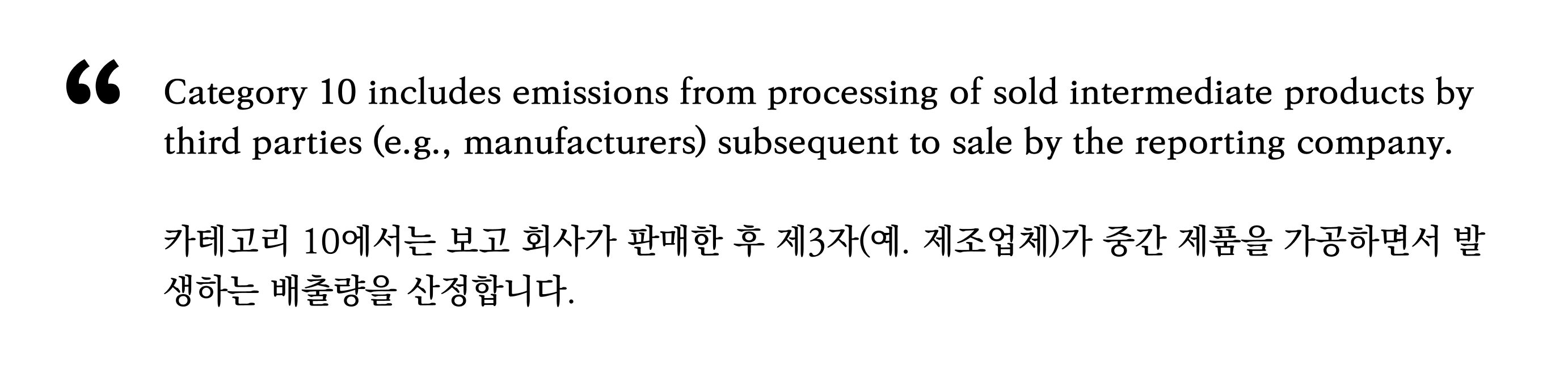서두에서 이 카테고리는 Scope 3 중에서도 ‘다운스트림’에 해당한다고 말씀드렸었지요. 그런데 판매한 제품을 ‘가공’하는 단계는 업스트림이 아닌가 싶은 의문이 드실 수도 있을 것 같습니다. 하지만 이 카테고리가 모든 기업에게 해당하지 않는다는 사실을 이해하신다면 의문이 해소되실 텐데요. 먼저 GHG 프로토콜에서 정의하고 있는 카테고리의 설명을 살펴볼까요?