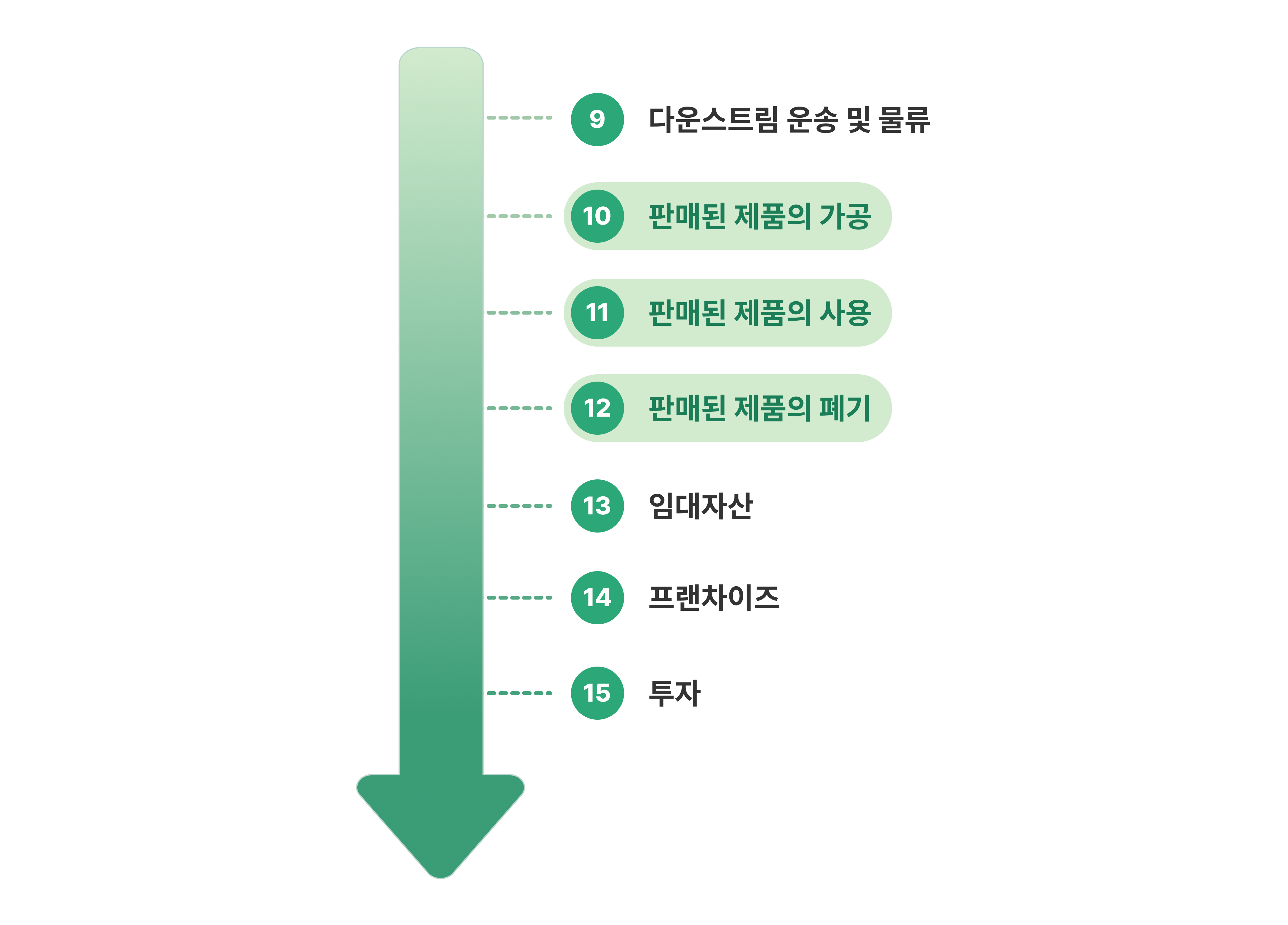 다운스트림에는 총 7개의 카테고리가 있습니다. 그 중 3개의 카테고리가 서로 단계를 이루듯 묶여 있는데요. 바로 판매제품의 가공 – 사용 – 폐기와 관련된 배출량인 카테고리 10부터 12까지입니다.
