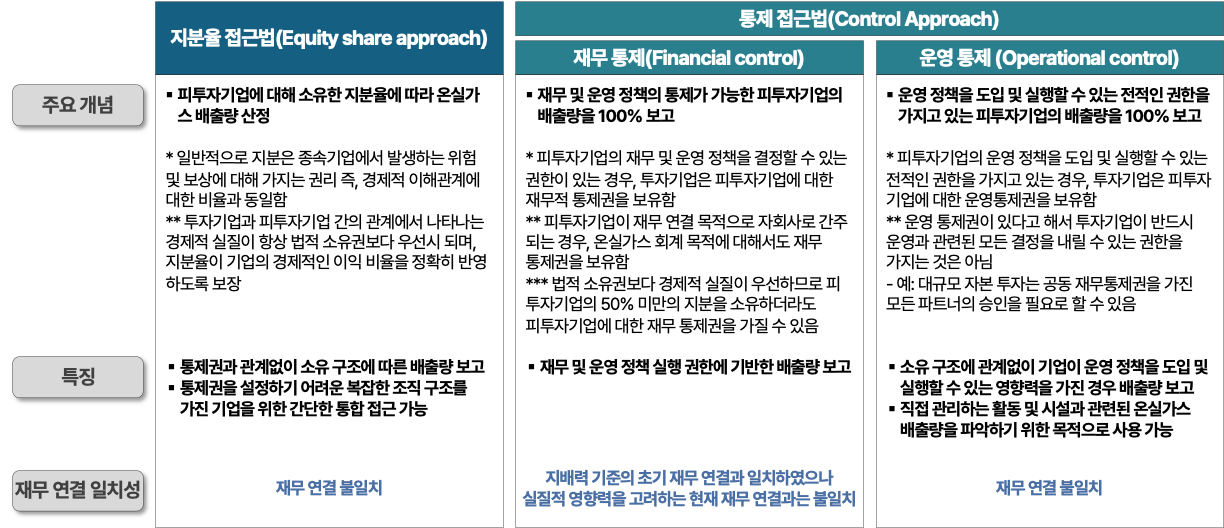 3) 운영통제 접근법(Operational Control Approach): 기업이 운영을 실질적으로 통제하는 경우 해당 법인의 배출량을 온전히 포함하는 방식