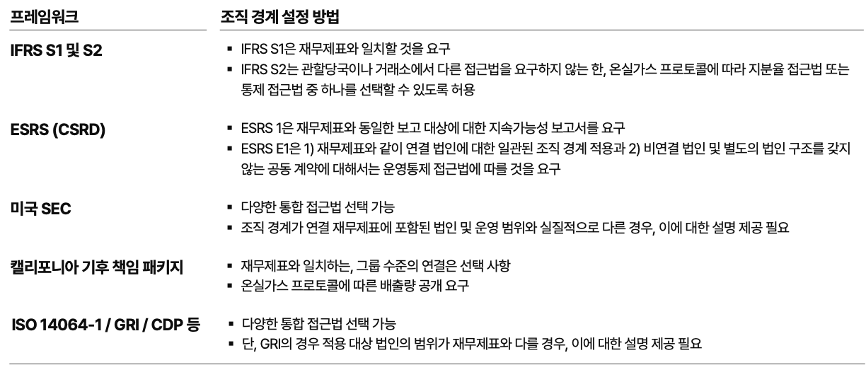 • 연결 기준 적용 확대: 온실가스 배출량 공시 시 연결 재무제표 기준을 적용하고, 운영통제 또는 재무통제 접근법 활용