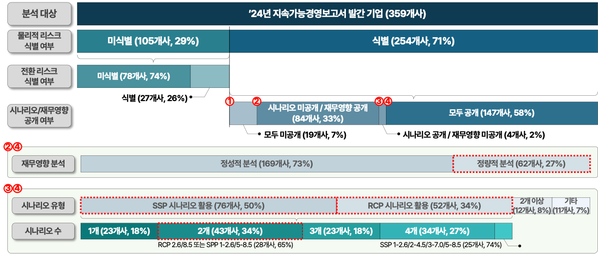 2024년 지속가능경영보고서 분석 결과, 국내 기업의 71%가 물리적 리스크를 식별하고 있는 것으로 나타났습니다. 특히, 물리적 리스크를 식별 및 공시한 기업 중 58%가 기후 시나리오의 정보와 재무영향 모두를 공개하고 있었습니다. 반면, 재무영향은 공개했음에도 불구하고 분석의 기초가 되는 기후 시나리오에 대한 정보를 공개하지 않은 기업이 33%로 나타났습니다.